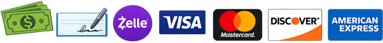 Accept cash, check, Zelle, Visa, Mastercard, Discover, and American Express cards.